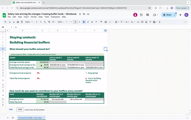 All you need to do is plug in your monthly spend, track what you’ve already saved, and set how much you can commit each month. The sheet shows your progress, highlights the gap, and keeps you motivated with a clear path forward.