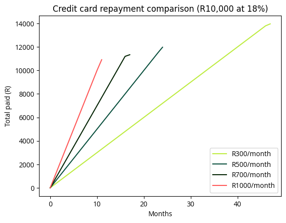After paying R300, you would still owe roughly R9,850. This is why it can feel like you are making payments but not much progress.