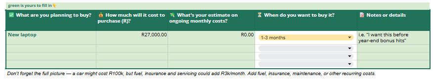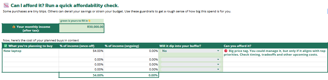 The cell on the very right of the table will then tell you how big of a deal this buy would be given your current finances and what to look out for.